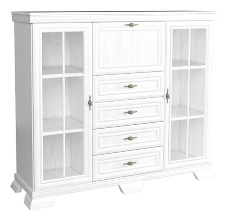 Prekrasna komoda Kraz s ostakljenim vratima, 4 ladice i sklopivim ormarićem dolazi u boji bor andersen.