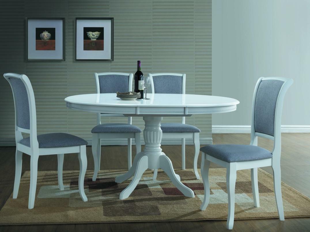 Blagovaonica Oliner 1 u elegantnoj kombinaciji bijele i sive boje unosi u interijer klasični šarm i suptilnu eleganciju. Okrugli blagovaonski stol Oliner na razvlačenje (106–141 cm) idealan je za 4 do 6 osoba i ističe se oblikovanom središnjom nogom. Četiri stolice Marti sa sivim tapecirungom i bijelom konstrukcijom nude udobno sjedenje i skladno se uklapaju sa stolom u cjelinu prikladnu za svakodnevne obroke i svečane trenutke.