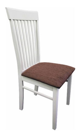 Blagovaonska stolica s visokim naslonom. Stolica je bijele boje sa sjedištem presvučenim u smeđu tkaninu.