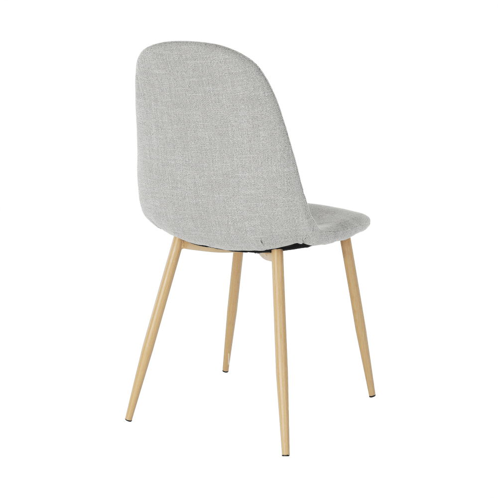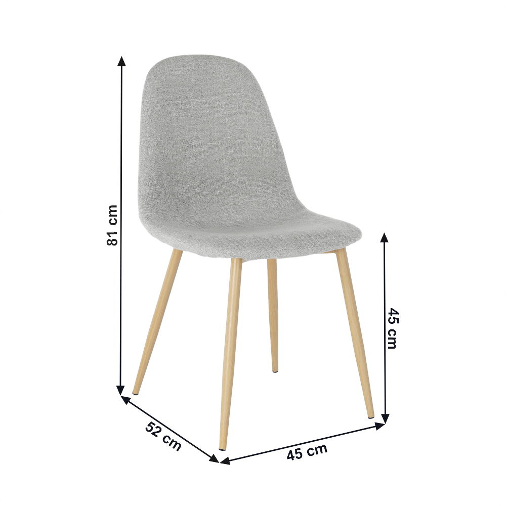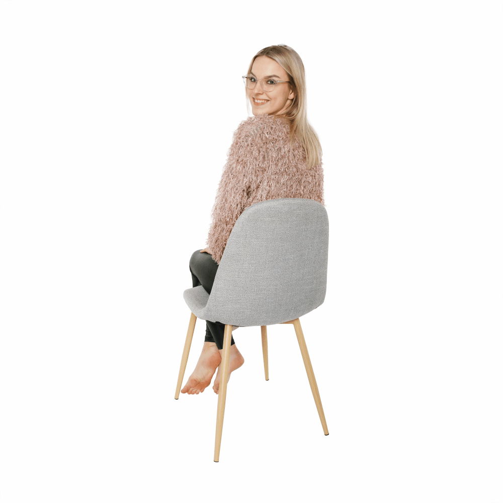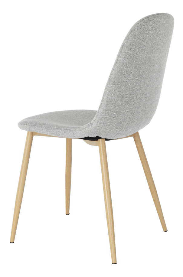Blagovaonska stolica Lagaa s lijepo oblikovanim sjedištem presvučenim tkaninom. Noge su metalne s površinskom obradom u dizajnu hrast sonoma.