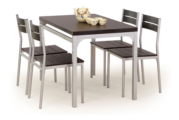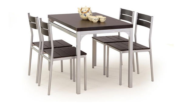 Blagovaonski set u boji wenge za 4 osobe. Izrađen je od laminirane iverice, a noge stola su od lakiranog čelika.