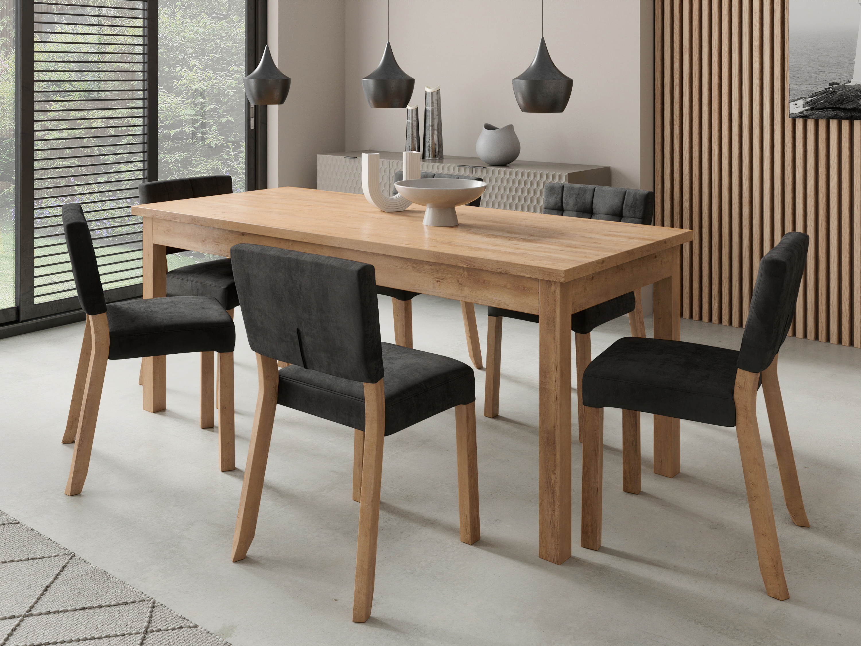 Blagovaonski set Raviel80 (hrast lefkas + kronos 27132) savršen je izbor za one koji traže kvalitetno i elegantno rješenje za svoju blagovaonicu. Stol je izrađen od visokokvalitetnog hrasta Lefkas i ugodne je smeđe boje koja se lijepo uklapa u svaki interijer. Stolice Kronos 27132 izrađene su od kaljenog drva i modernog su dizajna u crnoj boji. Ovaj set je vrlo udoban i ergonomičan, tako da ćete uživati u udobnom i ugodnom obroku i nakon nekoliko sati. Raviel80 savršen je dodatak svakoj blagovaonici i pružit će vam osjećaj luksuza i udobnosti.