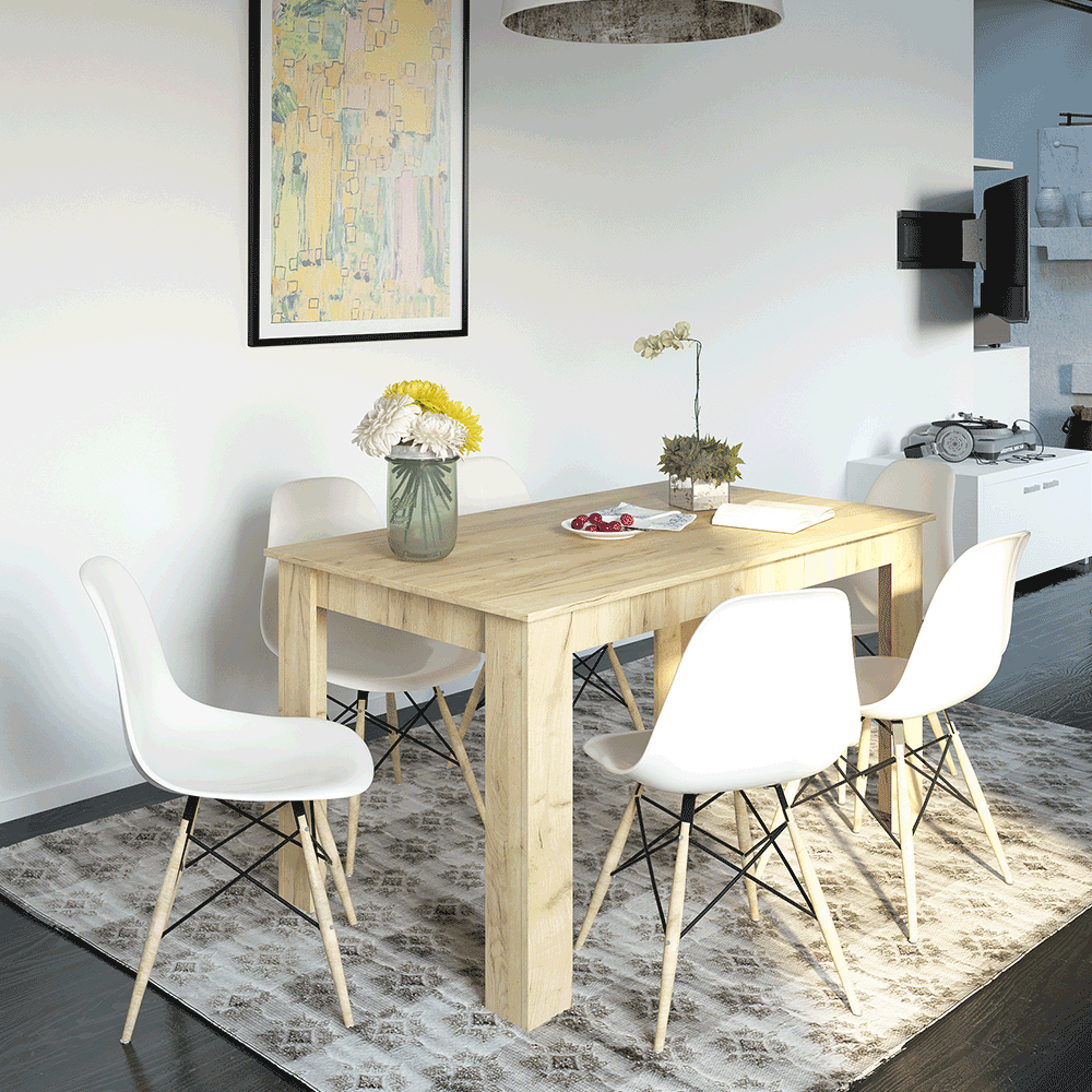 Unatoč jednostavnom obliku, stol za blagovanje Groot savršen je za zajedničke trenutke provedene u krugu najbližih. Veličine je 140×80 cm, tako da možete udobno smjestiti šest osoba u velikom stilu. Samo trebate dobro kuhati. U boji Artisan Oak, ovaj će se dragulj uklopiti gotovo svugdje i može se uskladiti s bilo kojim namještajem. Popularna, čvrsta i tradicionalno dokazana laminirana iverica osigurat će godine svakodnevne uporabe. Stol za blagovanje Groot bit će pravi komad za vašu blagovaonicu.