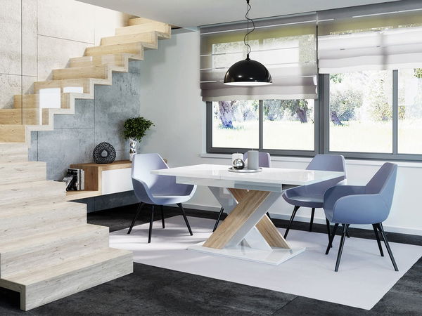 Moderan dizajn stola osigurava geometrijski oblikovana ploča. Stol možete kombinirati s namještajem istog stila ili ga možete kombinirati s namještajem s metalnim dijelovima kako biste postigli kontrast. Još jedna prednost stola je mogućnost rasklapanja. Stol u rasklopljenom stanju ima širinu od 180 cm, a u sklopljenom stanju 140 cm.