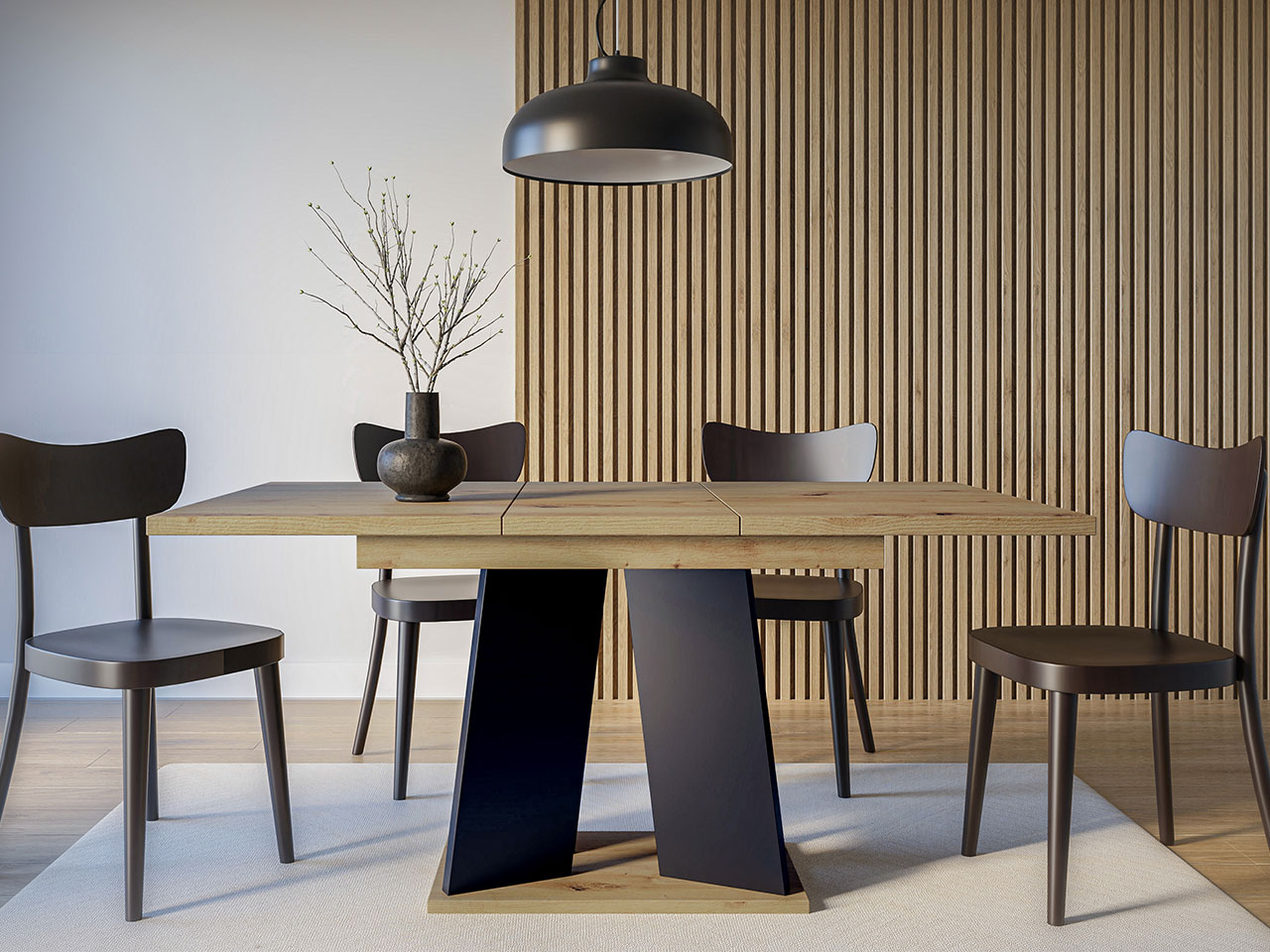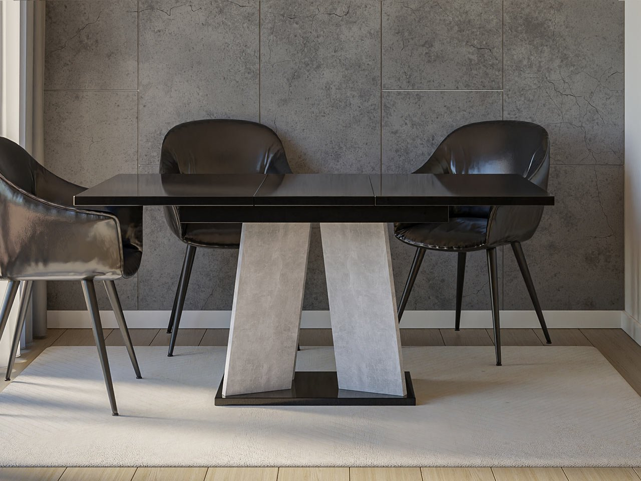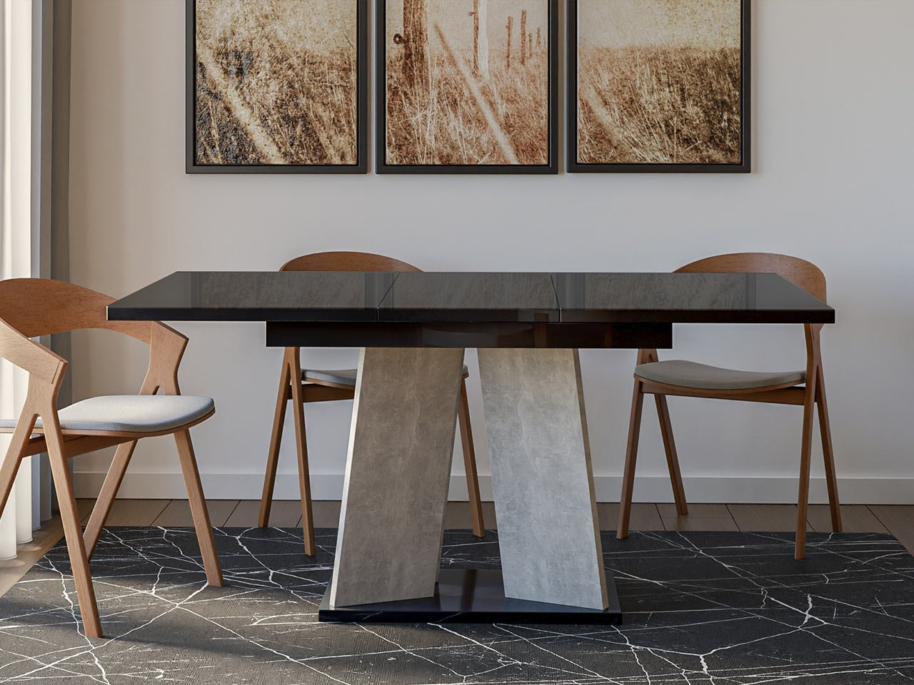 Blagovaonski stol na razvlačenje 120 cm Jeremias (crni sjaj + beton) (za 4 do 6 osoba)