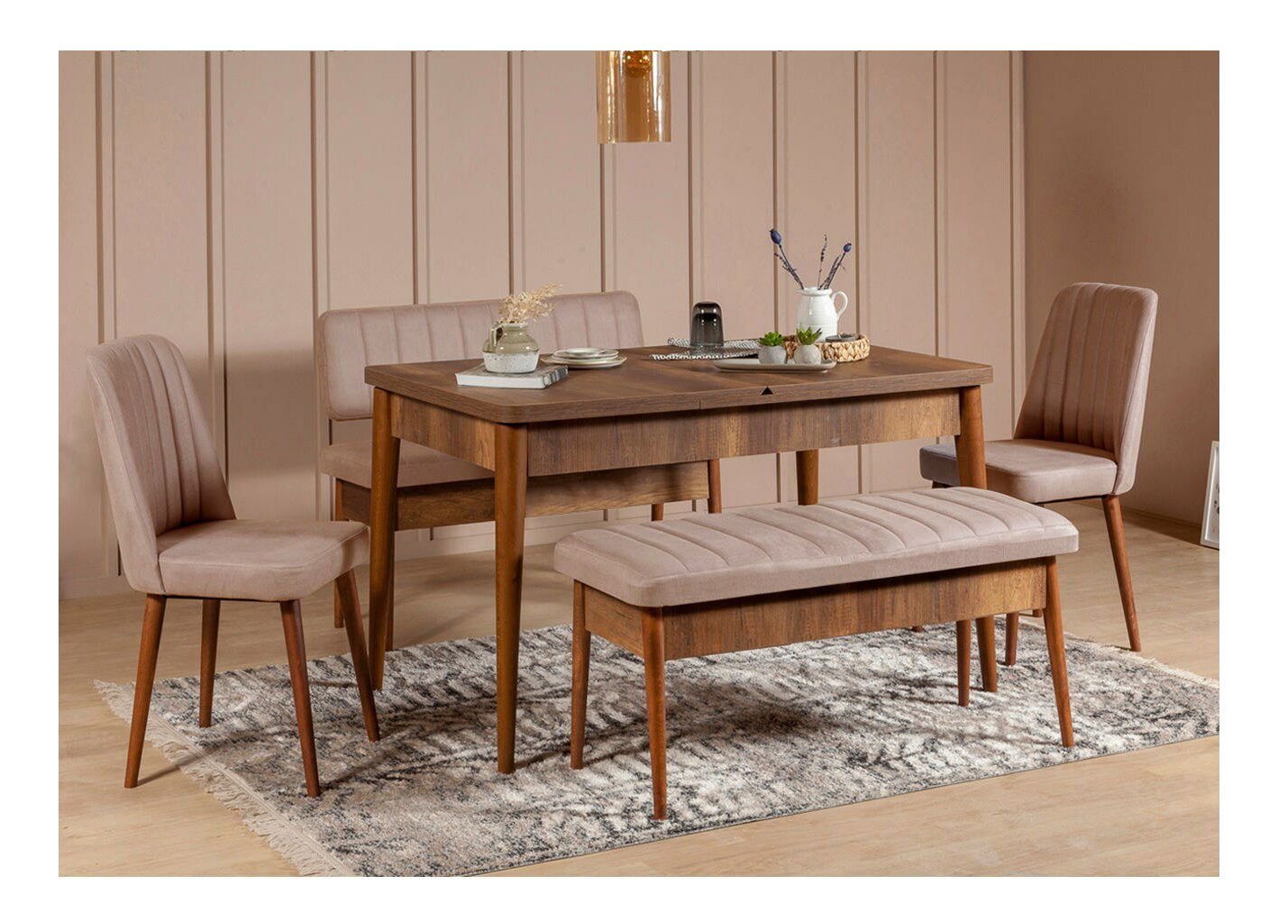 Blagovaonski stol na razvlačenje sa 2 stolice i 2 klupe Vlasta (orah + bež)