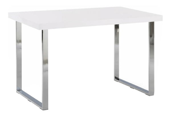 Dizajnerski stol s čvrstim postoljem. Korišten materijal je MDF bijela, ekstra visoki sjaj HG i krom.