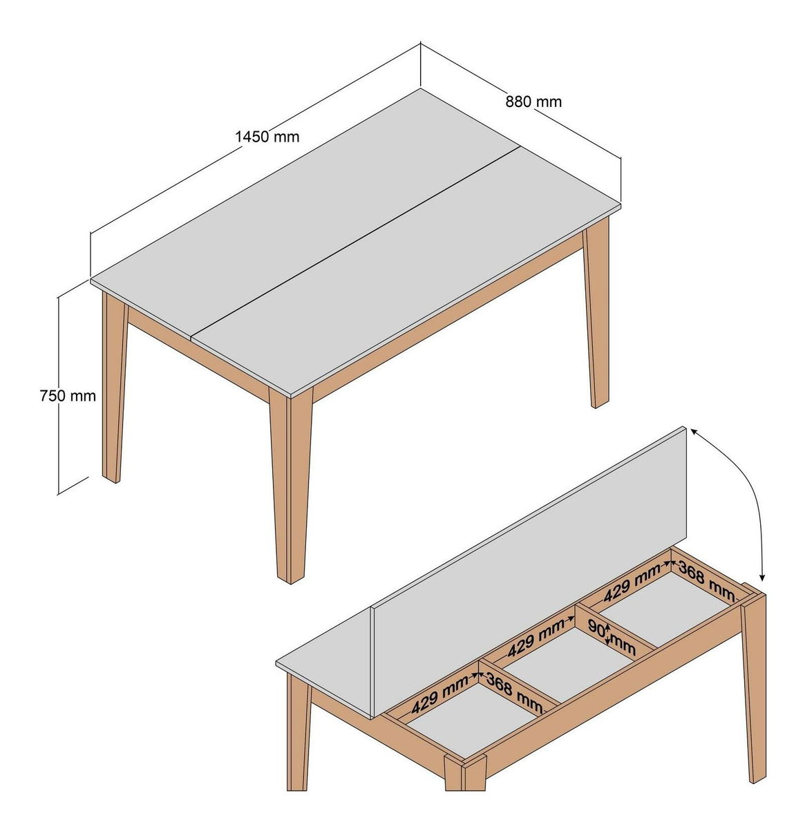 debljina: 18 mm, noge stola veličina: širina: 145 cm, visina: 75 cm, dubina: 88 cm, veličina prostora za odlaganje: 42,9 cm, visina: 9 cm