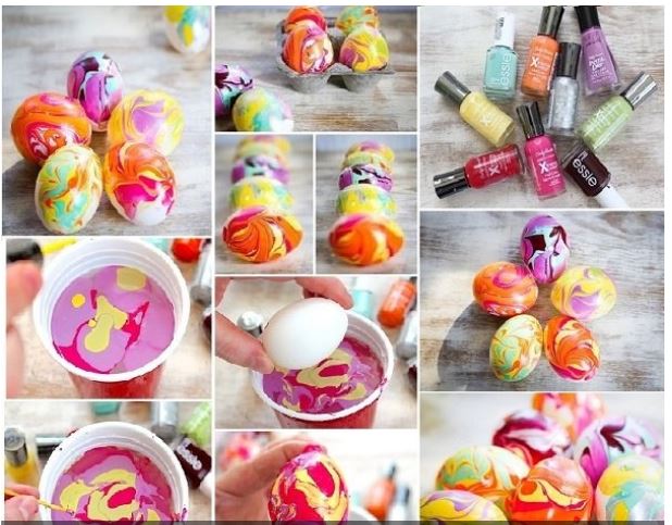Ispušemo bijelo jaje. U posudu ulijemo mlaku vodu, nakapamo u nju lak za nokte različitih boja i razvučemo po površini vode. Bolje je koristiti kvalitetniji lak koji ostaje na površini. Jaje ponorimo u vodu i uživamo u šarenilu boja koje smo “izvukli”. 🙂