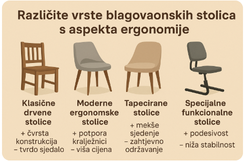 Na tržištu postoji mnoštvo vrsta blagovaonskih stolica. Usporedimo klasične drvene stolice, moderne ergonomske stolice, tapecirane stolice i specijalne funkcionalne stolice s aspekta zdravog i udobnog sjedenja:
