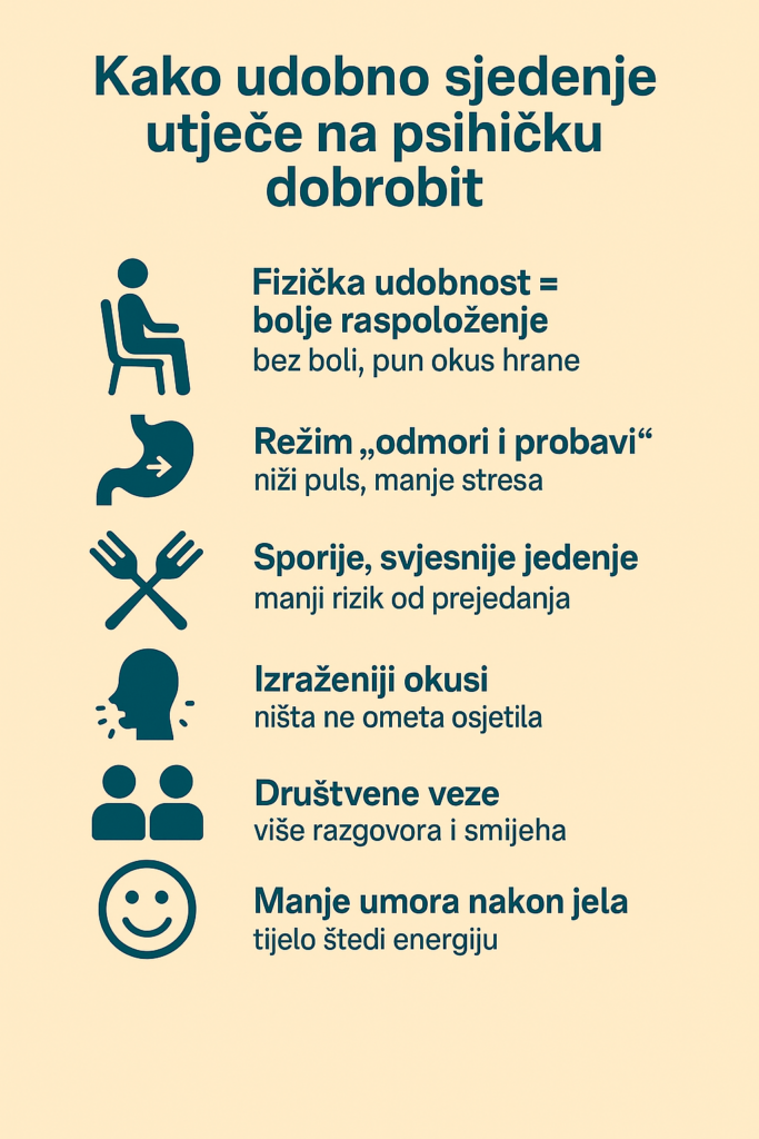 - Aktivacija režima „odmori se i probavljaj“: Udobno sjedenje pomaže tijelu preći u stanje „odmora i probave“, usporava puls i disanje te stvara osjećaj opuštenosti i zadovoljstva.