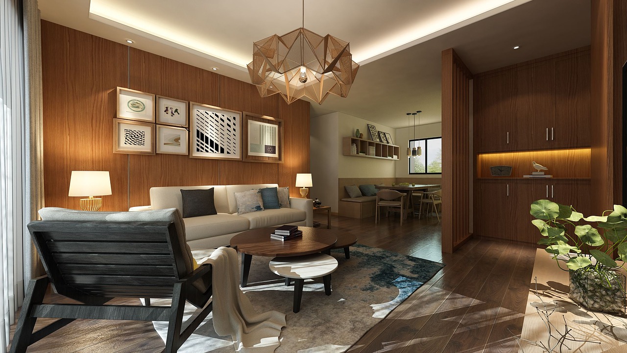 Kad je namještaj dizajnerski jednostavan dovoljan je par ispravno odabranih komada namještaja. Prikladne su police, vitrine i stolići od drva svijetle boje, kombinirani sa staklom, eventualno drugim materijalom svijetlih boja. Prilikom uređivanja izaberite 2-3 boje uz koje će se uklopiti namještaj i dodatci.
