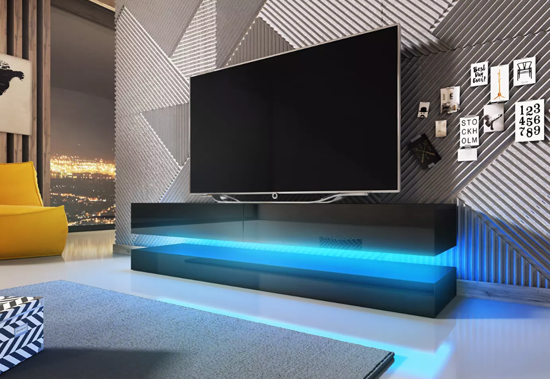 TV stolić s LED rasvjetom izgledaju vrlo efektno. Pogotovo kada je svjetlo ugašeno, izgledaju zaista impresivno, pogotovo ako imate bijelu ili crnu verziju visokog sjaja. Preporučljivo je postaviti i neku vrstu svjetiljke iza ekrana: noću je kontrast između osvijetljenog ekrana i tamne pozadine vrlo velik, pa gledanje televizije na ovaj način opterećuje oči.