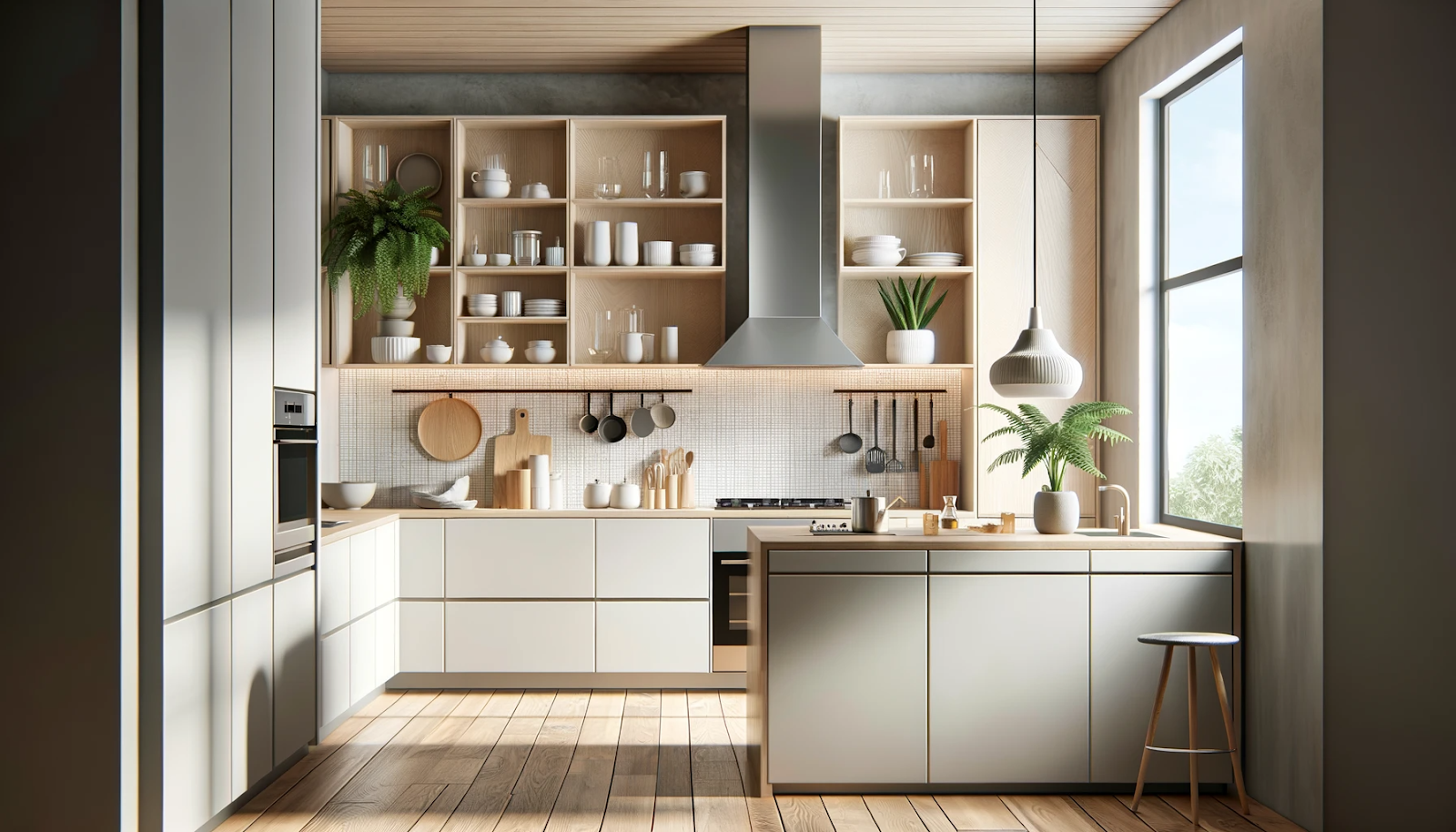 Minimalistički kuhinjski elementi u 2024. odlikuju se čistim linijama i skrivenim funkcionalnostima. Usredotočite se na jednostavne površine bez suvišnih ukrasa, s integriranim ručkama ili čak bez njih. Materijali poput matiranog nehrđajućeg čelika, stakla i glatkih laminata dominirat će, pri čemu će boje ostati u neutralnom spektru – od bijele, preko breskve do sive i crne.