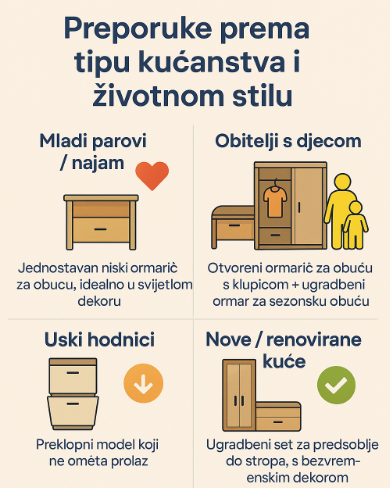 Odabir odgovarajućeg tipa ormarića za obuću ovisi o nekoliko čimbenika: veličini prostora, vrsti stanovanja, sastavu kućanstva, očekivanom vijeku trajanja namještaja i estetskim preferencijama. U zaključku stoga predstavljamo specifične preporuke prema tipičnim scenarijima.