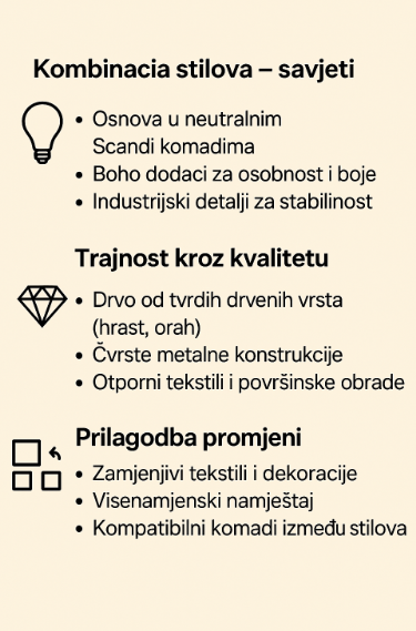 Odabir stila namještaja je odluka na dugi niz godina. Scandi donosi mir i jednostavnost, boho dodaje osobnost i boje, industrial pruža stabilnost i robusnost. Njihovom kombinacijom moguće je stvoriti dom koji je ne samo lijep, već i praktičan i bezvremenski (2Modern, 2020).