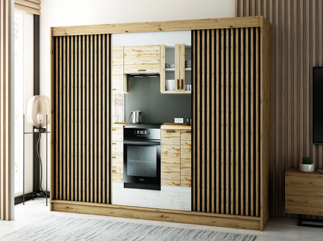 Zahvaljujući drvenom dizajnu, prirodni dojam privlači pogled na prvi pogled. Ovo je dvostruko istinito s veličinom ormara. U spavaćoj sobi, ormar je drugi najvažniji dio koji ne smije nedostajati. Letvičasti ormar zajedno s letvičastom komodom može se kombinirati i s bračnim krevetom u sličnom drvenom dekoru. No, krevet ne smije biti previše istaknut jer bi se dva potporna elementa “tukla” u jednoj prostoriji. Također možete odabrati jednostavan tapecirani krevet, ali sa suptilnom shemom boja. Ponekad je manje više.