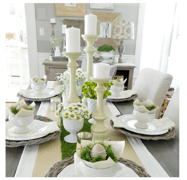 Potpuno vam je dovoljan običan bijeli stolnjak koji sigurno imate kod kuće. Cijeli stol možete uskladiti s bijelom bojom ili dodajte jednu ili dvije boje u obliku cvijeća ili ubrusa. Tako ćete oživjeti cijeli aranžman.