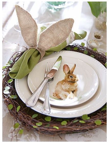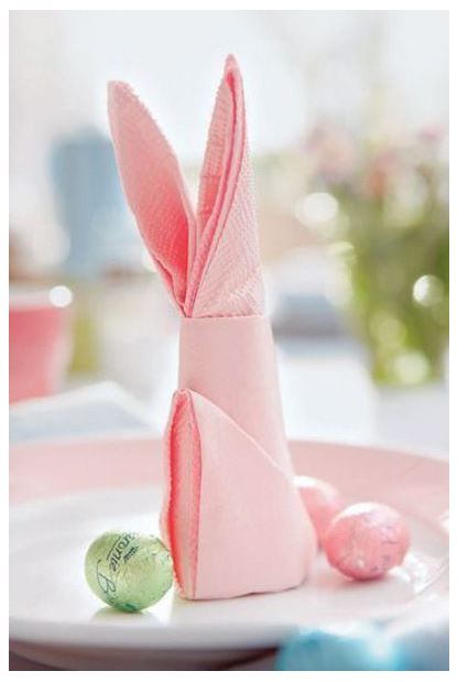 Ova draga i jednostavna dekoracija će vrlo lijepo izgledati na stolu uz tanjure umjesto klasičnih ubrusa. Ipak, računajte na to da će vaši gosti htjeti odmotati zeca i koristiti ubrus. 🙂