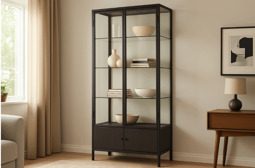 Visoka crna metalna vitrina sa staklenim vratima i ukrasnim predmetima u dnevnoj sobi.