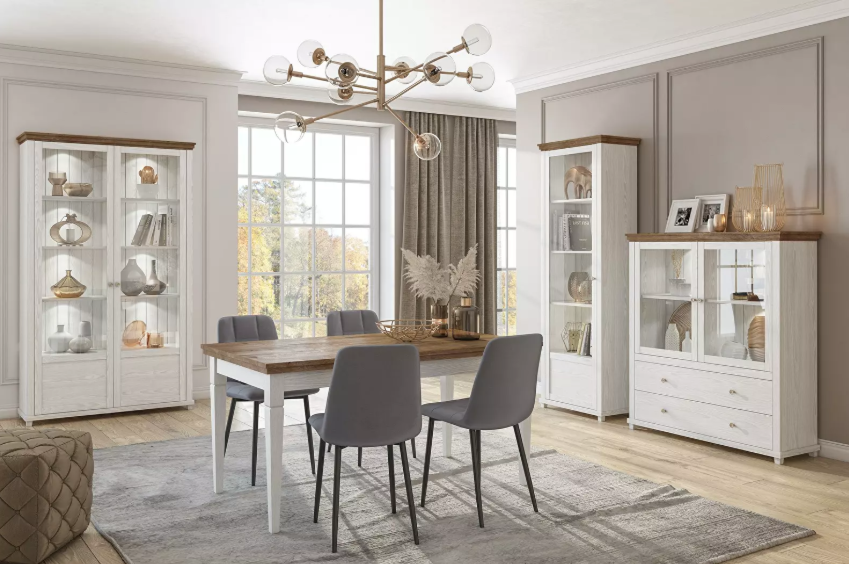 Blagovaonica s bijelim namještajem i drvenim pločama, uključujući stol, stolice i vitrine.