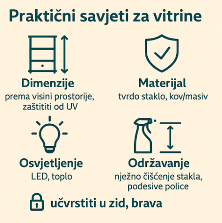 1. Dimenzije i smještaj – birajte vitrinu prema visini prostorije; koristite prostor uz prozore ili izvore svjetlosti, ali zaštitite izložene predmete od izravnog UV svjetla.