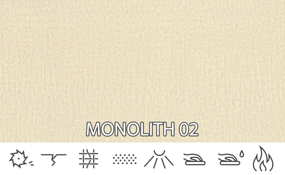 Monolith je izdržljiva plišana tkanina ugodna na dodir. Prekrivena je posebnim zaštitnim slojem koji stvara hidrofobni sloj koji štiti od brzog upijanja prolivenih tekućina. Vrlo je otporna na izbljeđivanje. Može se čistiti proizvodima za njegu tkanina. Ne smije se izbjeljivati niti izlagati pretjerano visokim temperaturama , također se ne smije sušiti u sušilici.
