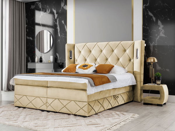 Kontinentalni krevet je idealan izbor za one koji traže udobnost i stil. Kontinentalni krevet Banjul Lux uljepšat će vam san i svaki trenutak proveden u njemu bit će ispunjen luksuzom i udobnošću. Ovaj visoko funkcionalni model dizajniran je s obzirom na vaše potrebe. Opremljen je s dva spremnika za posteljinu smještena s obje strane, zahvaljujući čemu je pohrana i pristup posteljini iznimno praktičan. Predstavljena varijanta ima dva madraca: glavni i gornji. Gornji madrac izrađen je od hipoalergijskih materijala. Antibakterijska i antifungalna poliesterska pletenina jamči svježinu i higijenu kroz dugi period. Također ima četiri čvrste gumene trake koje sprječavaju pomicanje madraca, čime osiguravaju miran san bez neugodnih pomaka. Kontinentalni krevet nije samo udobnost, već i ljepota. Posebno ukrašeno uzglavlje čini ga ukrasom vaše spavaće sobe, a rasvjeta naglašava prekrasan karakter svakog interijera. Dostupne dimenzije: 120: dužina: 212 cm, širina: 168 cm, visina: 142 cm, površina za spavanje: 120 x 200 cm, dimenzije jednog spremnika (krevet ima dva): dužina: 197 cm, širina: 56 cm, visina: 19 cm. 140: dužina: 212 cm, širina: 188 cm, visina: 142 cm, površina za spavanje: 140 x 200 cm, dimenzije jednog spremnika (krevet ima dva): dužina: 197 cm, širina: 66 cm, visina: 19 cm. 160: dužina: 212 cm, širina: 208 cm, visina: 142 cm, površina za spavanje: 160 x 200 cm, dimenzije jednog spremnika (krevet ima dva): dužina: 197 cm, širina: 76 cm, visina: 19 cm. 180: dužina: 212 cm, širina: 228 cm, visina: 142 cm, površina za spavanje: 180 x 200 cm, dimenzije jednog spremnika (krevet ima dva): dužina: 197 cm, širina: 86 cm, visina: 19 cm. 200: dužina: 212 cm, širina: 248 cm, visina: 142 cm, površina za spavanje: 200 x 200 cm, dimenzije jednog spremnika (krevet ima dva): dužina: 197 cm, širina: 96 cm, visina: 19 cm. Izvedba: kutija: 16 mm debela ploča za namještaj + 6 cm masivno drvo, naslon: 16 mm ploča za namještaj + borovo drvo + pjena T25 + 300 g pahuljaste vate, ima dva spremnika za posteljinu – krevet standardno s dva spremnika za posteljinu, na obje strane kreveta, podizanje oba dijela zahvaljujući oprugama, što čini rukovanje vrlo jednostavnim i laganim, glavni madrac: džepićaste opruge + pjena T25, stupanj tvrdoće glavnog madraca (srednji sloj kreveta): H3, sasvim gore – gornji madrac (Mandula topper): srednje tvrd, debljina cca 2,5 cm, prošivena navlaka, topper izrađen od hipoalergijskih materijala najviše kvalitete: antibakterijska i antifungalna poliesterska pletenina s gramaturom 200 g/m², 20 mm PU pjena: odlikuje se visokom gustoćom, odgovarajućom tvrdoćom i elastičnošću, niskom sklonošću deformacijama, visokom udobnošću korištenja, vrlo pahuljasta vata 100 g/m² od poliesterskog vlakna, vata s gramaturom 35 g/m² od visokokvalitetnog netkanog materijala, 82 g/m² poliestersko mikrovlakno: prozračno, visoka apsorpcija vlage, antialergijsko, barijera protiv prašine i grinja, topper ima 4 čvrste gumene trake koje sprječavaju pomicanje madraca, obrub: obrubljen trakom po obodu, obostran – obje strane pružaju korisnu površinu, preporučuje se okretati madrac svakih 2 – 3 mjeseca, može se prati na 30˚C, crne drvene noge visoke 4 cm, krevet nije samostojeći – naslon je tapeciran vlaknastim tekstilom, rasvjeta uključena u cijenu kreveta, noćni stolić prikazan na slici nije uključen u cijenu kreveta. Jamstvo: 24 mjeseca.