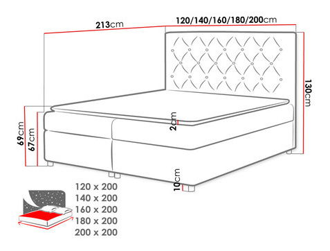 Kontinentalni krevet je idealan izbor za one koji traže udobnost i stil. Balicci je stilski kontinentalni krevet, izrađen od visokokvalitetnih materijala, koji će vam osigurati zdrav i udoban san. Krevet se sastoji od 3 dijela: - 2 spremnika, - glavni madrac, izrađen od opruga i visokoelastične pjene, - gornji madrac – topper, osigurava osjećaj opuštenosti. A osim toga – njegovo uzglavlje bit će savršen dekorativni element vaše spavaće sobe – prošiveno je. Savršeno će odgovarati klasičnom, ali i modernom interijeru. Dimenzije: Krevet 120: širina: 120 cm, visina: 123 cm, duljina: 211 cm Površina za spavanje: 120 x 200 cm Krevet 140: širina: 140 cm, visina: 123 cm, duljina: 211 cm Površina za spavanje: 140 x 200 cm Krevet 160: širina: 160 cm, visina: 123 cm, duljina: 211 cm Površina za spavanje: 160 x 200 cm Krevet 180: širina: 180 cm, visina: 123 cm, duljina: 211 cm Površina za spavanje: 180 x 200 cm Boje: mogućnost odabira boja ovdje Sastav kontinentalnog kreveta: na donjem dijelu kreveta nalazi se spremnik za posteljinu: krevet s dva spremnika s obje strane kreveta je standard, podizanje oba dijela iznad spremnika je pomoću opruga, zahvaljujući čemu je otvaranje vrlo jednostavno i lako. sredina - madrac: sastav: džepičaste opruge Pocket (madrac tipa Pocket sadrži 272 cilindrične opruge na 1 m2, što omogućuje vrlo dobro i udobno korištenje madraca izravno na leđa i cjelokupne obline tijela), visokoelastična pjena T30, u gornjem dijelu - Topper: sastav: pjena - visokoelastična pjena 2,5 cm (odlikuje se iznimnom elastičnošću, otpornošću i prozračnošću), navlaka - zatvarač u obliku C, visina Toppera je cca 2,5 cm, dodatne informacije: nogice su kromirane, uzglavlje prošiveno presvučenim gumbima Mogućnost kupnje: noćni stolić Umaru u boji kao krevet Dimenzije spremnika: visina: 25 cm duljina: 197 cm širina: 120 / 200 - 56,5 cm 140 / 200 - 66,5 cm 160 / 200 - 76,5 cm 180 / 200 - 86,5 cm 200 / 200 - 96,5 cm Jamstvo: 24 mjeseca