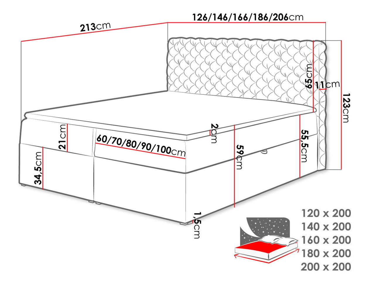 200 x 200 cm, dimenzije jednog spremišnog prostora (krevet ima dva): duljina: 198 cm, širina: 96 cm, visina: 32 cm.
