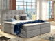 Tapecirani bračni krevet s visokim zaglavljem ukrašenim gumbima i šavovima. Nudimo u nekoliko boja.