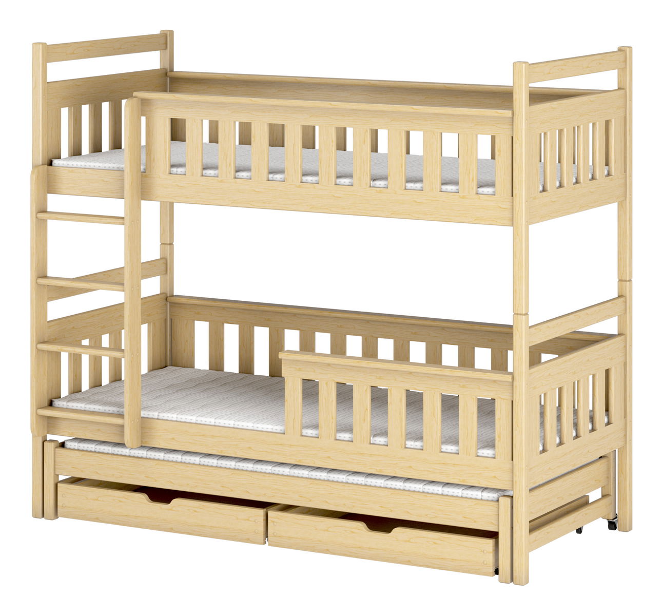 Krevet na kat Karla sa zaštitnim pregradama koje sprječavaju pad. U donjem dijelu kreveta nalazi se izvlačni pomoćni ležaj. Visina od poda do gornjeg ležaja je 135 cm, do srednjeg 50 cm i do najdonjeg 35 cm. Krevet je izrađen od borovine. U donjem dijelu je i prostor za odlaganje u obliku dvije ladice.