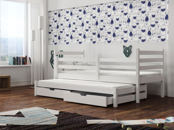 Krevet Monty na razvlačenje za dvije osobe. Krevet je izrađen od ploča borovine. Sve korištene boje i lakovi imaju potrebne certifikate. Krevet ima dvije ladice koje služe kao prostor za odlaganje. Gumeni kotačići ladica neće oštetiti podove.