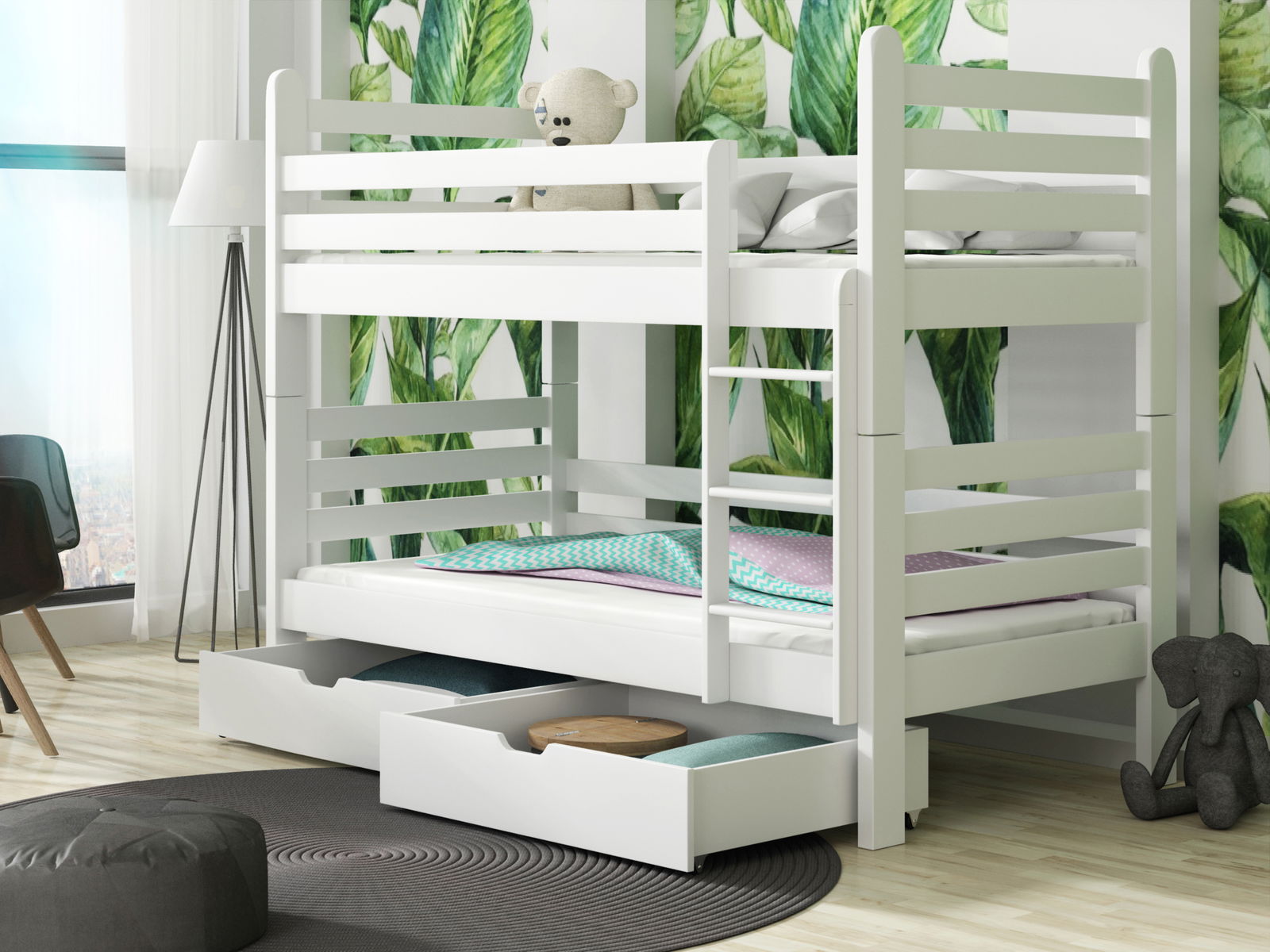 Krevet na kat Paul ima zaštitne pregrade i izrađen je od borovine.2 ladice služe kao prostor za odlaganje, a gumeni kotačići neće oštetiti podove.