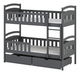 Krevet na kat Antone prikladan za manju djecu. Krevet ima zaštitne pregrade visoke 26 cm. Udaljenost između ležajeva je 70 cm. Ladica ima gumene kotačiće koji neće oštetiti drvene podove.