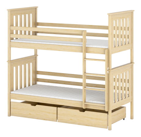Krevet na kat Brad prikladan je za dvoje djece. Udaljenost između ležajeva je 78 cm. Visina od poda do gornjeg ležaja je 124 cm, a do donjeg 78 cm. Ljestve se mogu montirati na obje strane. Ladice imaju gumene kotačiće koje neće ogrebati drvene podove.
