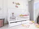 Dječji krevet Donna je moderno i praktično rješenje za dječju sobu. Izrađen je od drva borovine. Moguće je montirati i mrežu protiv komaraca. Ladice su izrađene od iverice i imaju gumene kotačiće koji neće ogrebati drvene podove.