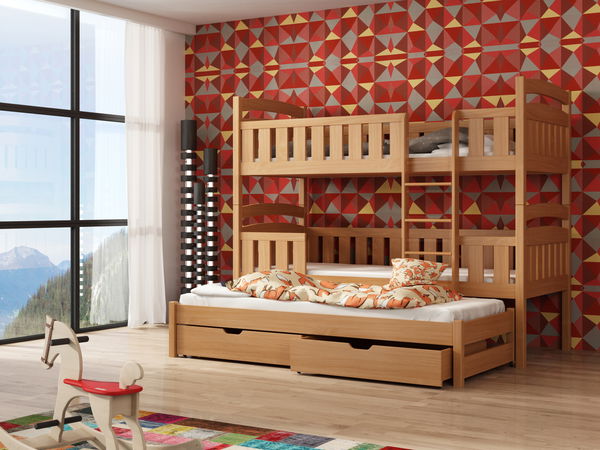 Površina za spavanje pomoćnog ležaja je za 10 cm manja od ostalih. Izrada od borovine.