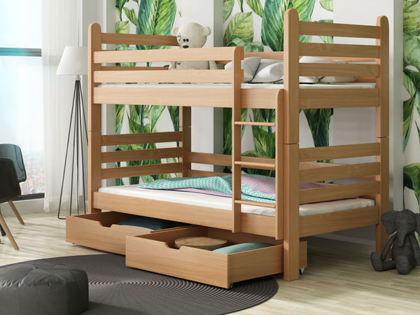 Krevet na kat Paul ima zaštitne pregrade i izrađen je od borovine.2 ladice služe kao prostor za odlaganje, a gumeni kotačići neće oštetiti podove.