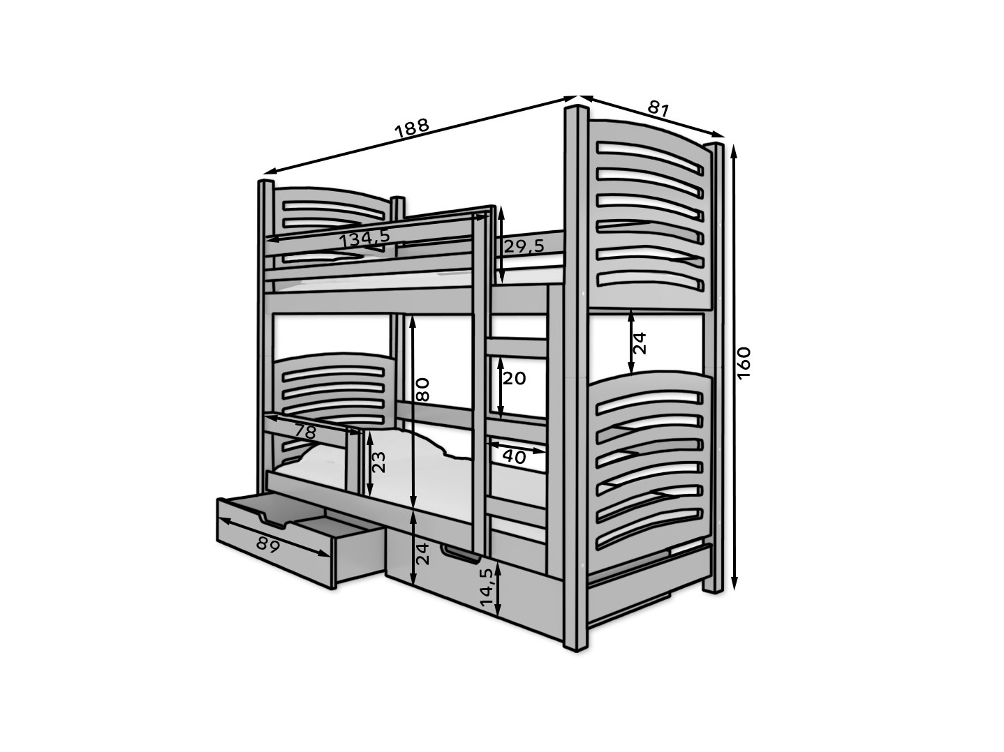 borovina, sredina kreveta i prednji dio ladica su od MDF ploče