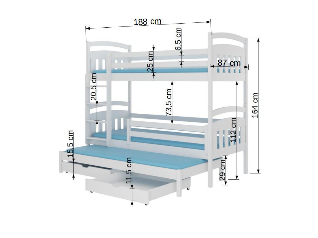 80x180 cm, donji pomoćni ležaj ima madrac 10 cm kraći