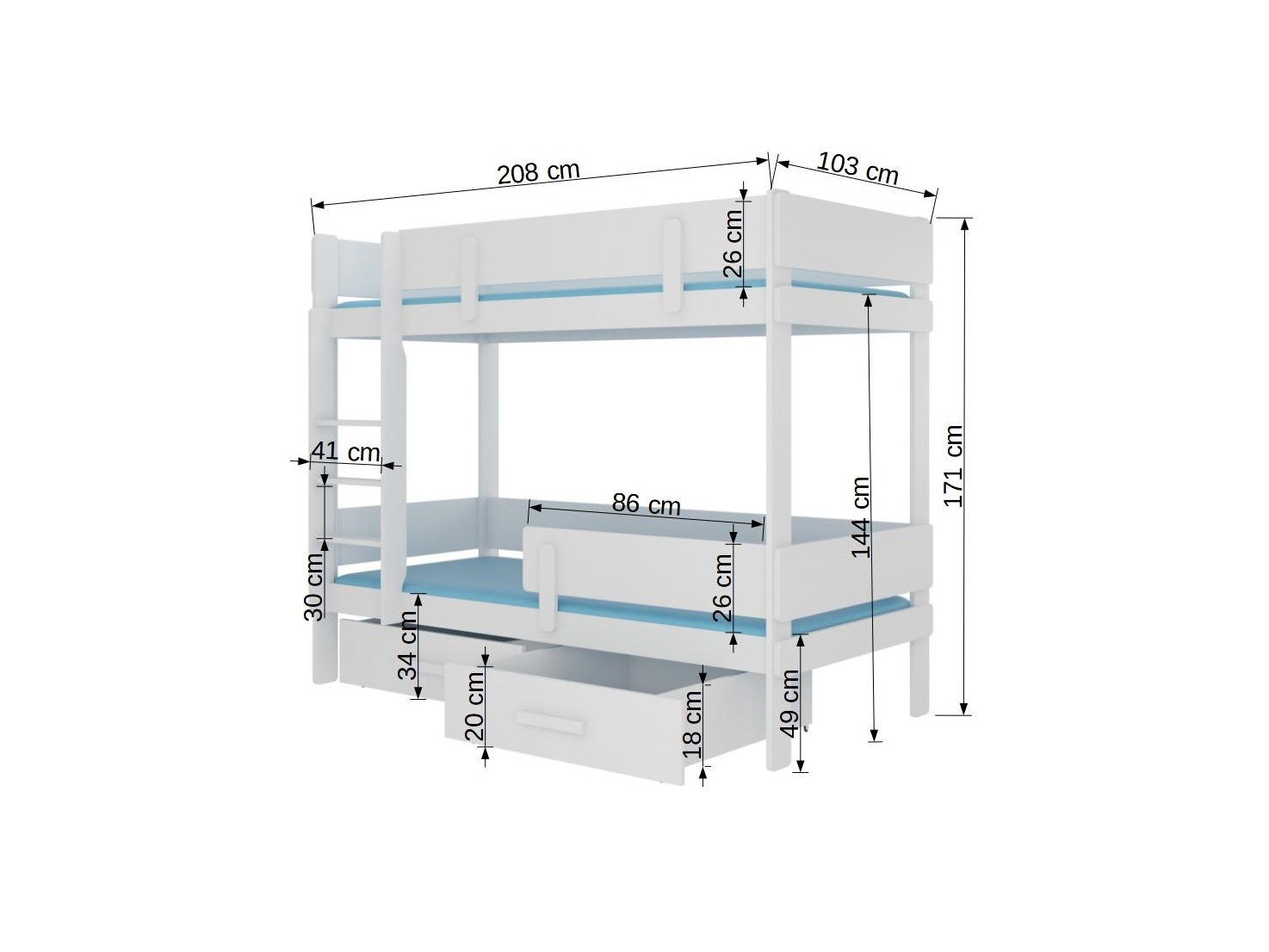 Dječji krevet na kat 200x90 cm Ellen (s podnicom i madracem) (siva + bijela)