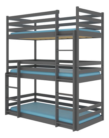 Dječji krevet na kat 200x90 cm Teodor (s podnicom i madracem) (grafit) idealno je rješenje za obitelji s više djece ili goste. Ovaj trokatni krevet izrađen je od kvalitetnog borovog drva, s nogama debljine 40x40 mm i ostalim elementima 20-22 mm, što jamči čvrstoću i izdržljivost. Podnica od lamela debljine 2 cm pruža maksimalnu udobnost i podršku. Madrac od pjene s navlakom na patent jamči miran i ugodan san. Barijera sprječava pad s gornjeg kreveta. Krevet Teodor nudi tri razine spavanja i mogućnost izbora strane ljestvi. U proizvodnji se koriste ekološke, vodene boje. Paket sadrži sav potreban pribor za montažu i upute. Dimenzije: visina: 210 cm, dubina: 208 cm, površina za spavanje: 90x200 cm. Ukupna težina paketa: 118 kg.