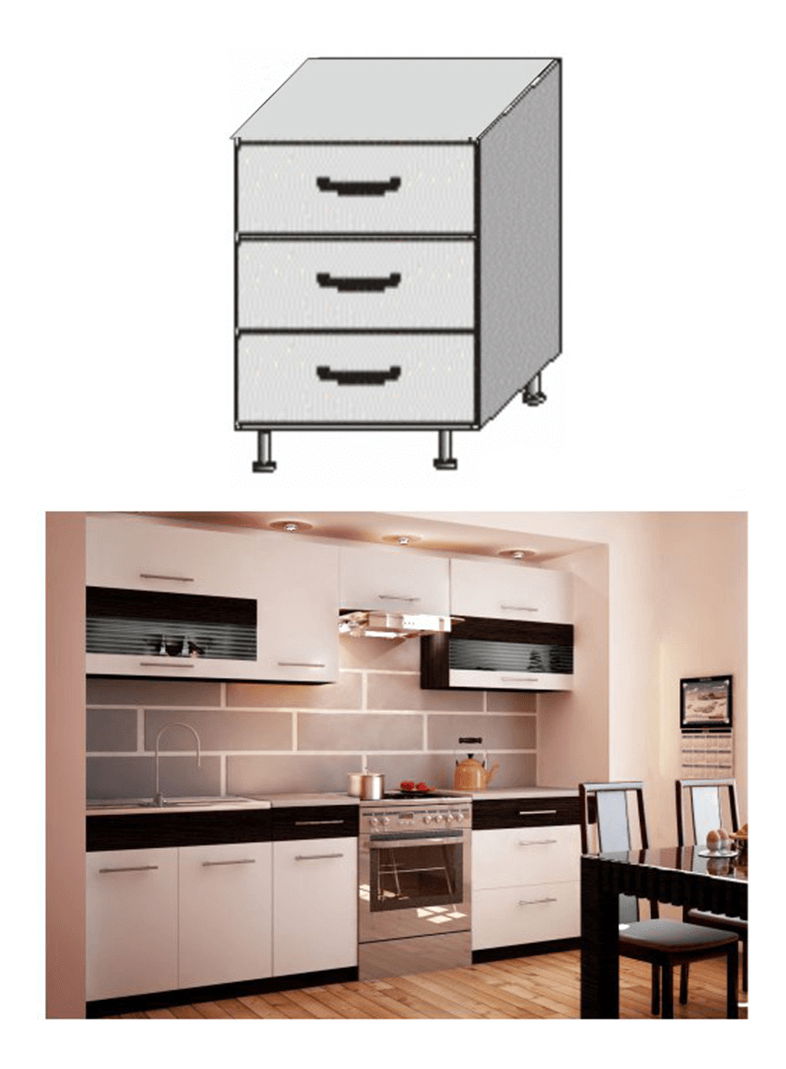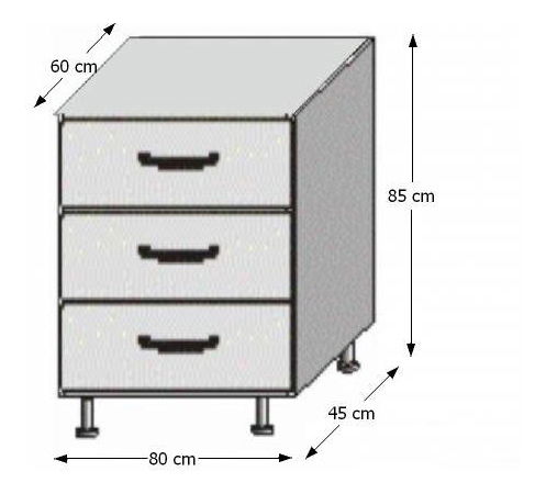 Donji dio kuhinjskog seta s tri ladice. Isporučuje se s radnom pločom. -