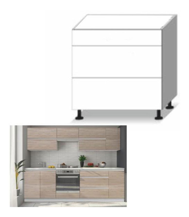 Donji kuhinjski ormarić iz linije namještaja Lilouse. Ormarić ima 3 ladice sa sistemom tihog zatvaranja. Isporučuje se s radnom pločom i donjom letvicom.