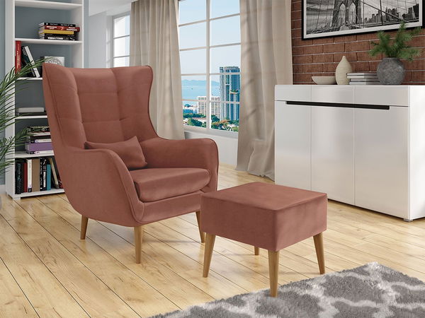Zahvaljujući njemu, soba postaje ugodna i dobiva kutak za opuštanje i odmor. Možemo ga postaviti uz kauč, kamin ili policu za knjige. Jedan od prijedloga u našoj ponudi je sa tabureom. Karakteristična značajka ovog namještaja je zaobljena poleđina, koja podsjeća na kapuljaču. Prednji dio stolice ima ukrasne šavove i udobne naslone za ruke. Tehnički aspekti stolice također su vrijedni spomena. Prva od njih je korištena pjena T30 debljine do 12 cm. Drugi aspekt je tkanina kojom je presvučena stolica. Ne samo da ima visoku otpornost na trenje i blijeđenje, već je ugodan i mekan na dodir. Osim toga, u kompletu se nalazi i tabure koji će izležavanje na stolici učiniti ugodnijim, a tu je i mali jastučić.