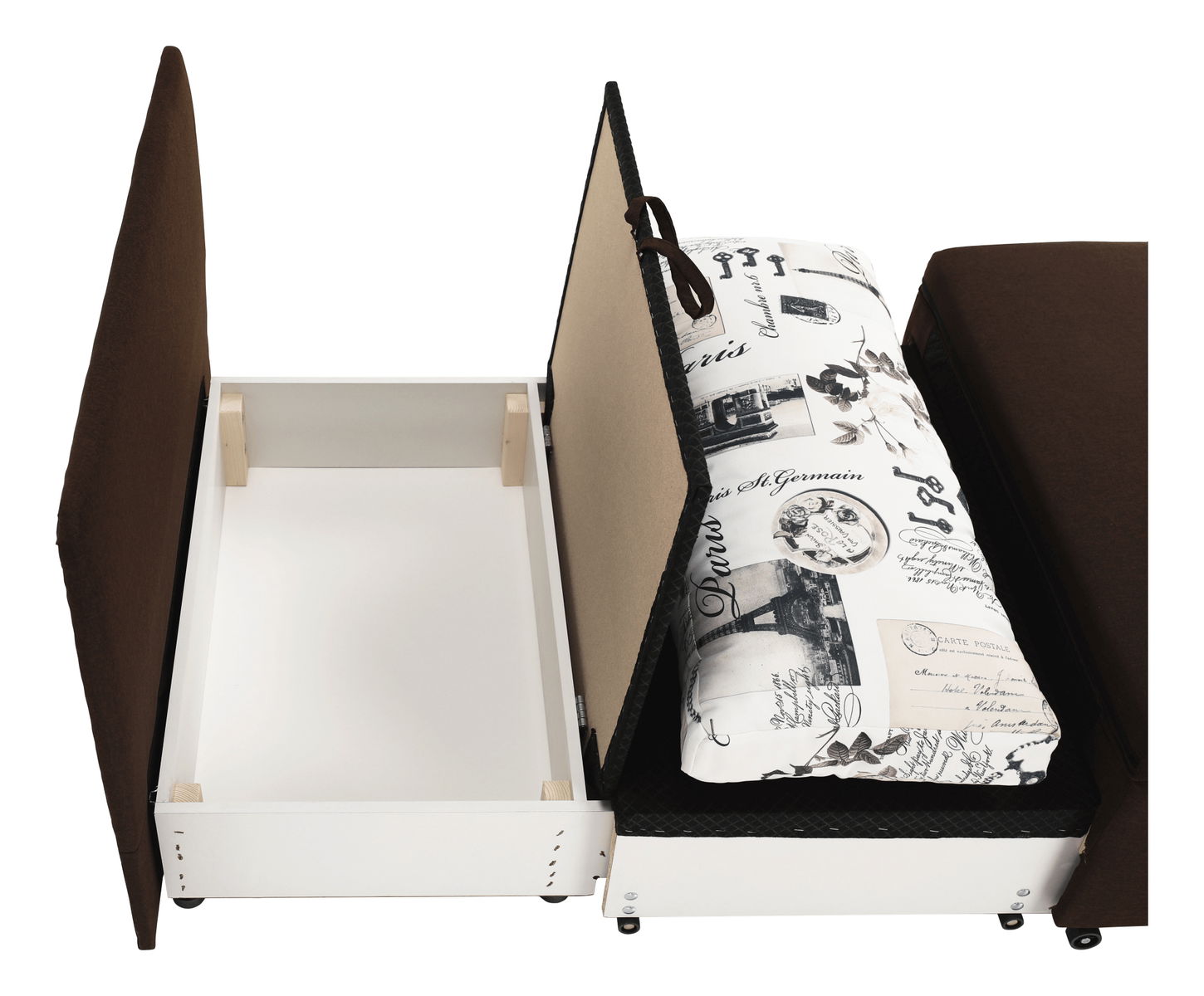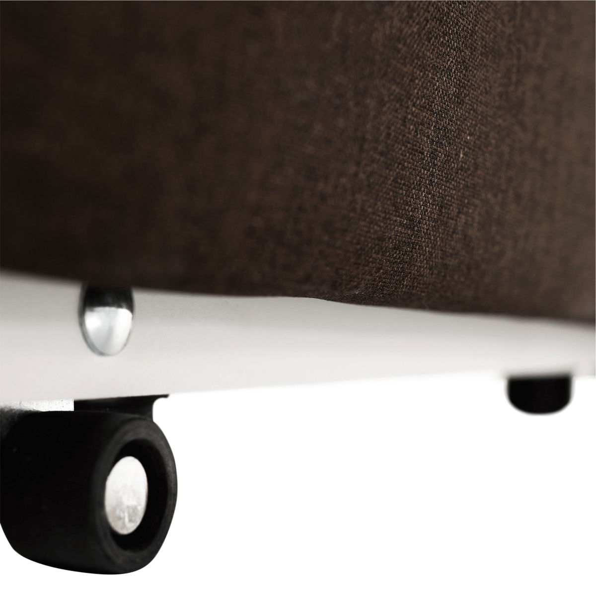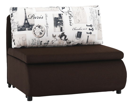 Fotelja modernog dizajna koja se po potrebi može razvući za povremeno spavanje. Fotelja je presvučena u smeđu tkaninu.