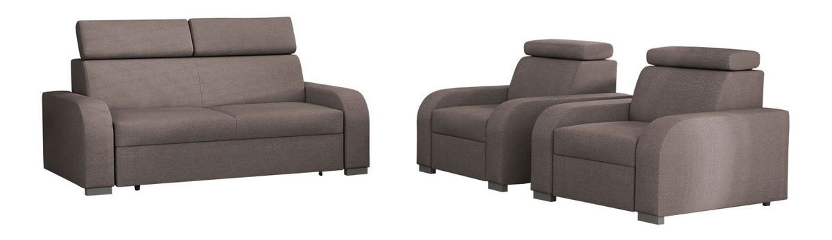 Tapecirani set Losar 3 + 1 + 1 idealan je izbor za one koji traže udobnost i stil. Losar 3 + 1 + 1 je garnitura s modernim dizajnom i atraktivnim izgledom. Ima inovativna rješenja koja pružaju vrhunsku udobnost tijekom odmora. Garnitura se sastoji od udobne trosjede i dviju fotelja, savršeno usklađenih sa suvremenim trendovima. Dostupna je u nekoliko bezvremenskih boja, što omogućuje savršeno uklapanje u interijer. Tapecirani namještaj iz seta opremljen je podesivim naslonima za glavu, jednostavnim oblicima i udobnim sjedalima izrađenim od visokokvalitetnih materijala. Dimenzije trosjeda Losar 3: duljina: 200 cm, širina: 100 cm, visina: 85–100 cm. Dimenzije fotelje Losar 1 (x2): duljina: 105 cm, širina: 100 cm, visina: 85–100 cm. Izvedba: okvir od borovine + iverica + MDF ploča, naslon: T30/30 pjena, sjedalo: T30/30 pjena + opruga tipa B, T23/15 pjena u naslonima za glavu, bez funkcije spavanja, plastične noge, podesivi nasloni za glavu, čvrsto pričvršćen tapecirani naslon, slobodnostojeća garnitura (tapecirana tkaninom). Jamstvo: 24 mjeseca.