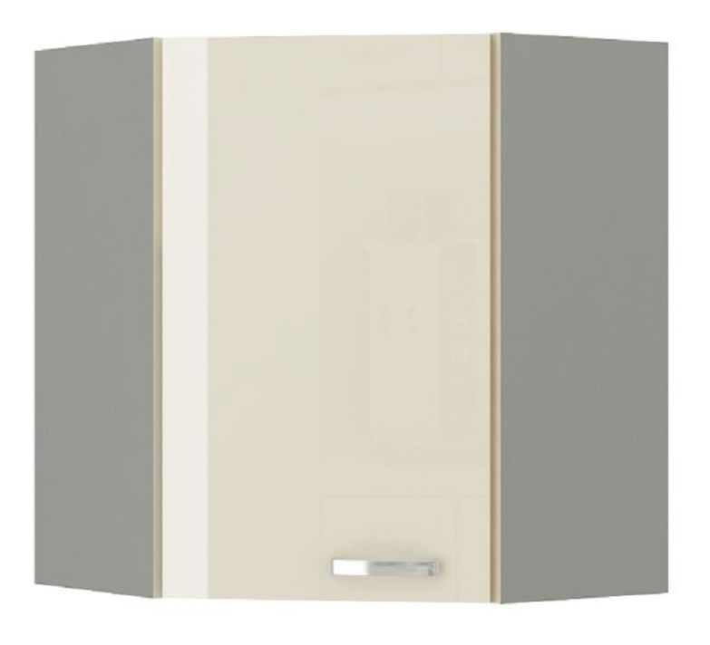 Gornji kutni kuhinjski ormarić širine 59 cm, visine 71,5 cm s metalnim ručkama. Materijal je MDF ploča, korpus je sive boje, a vrata su visokog crnog ili krem sjaja.