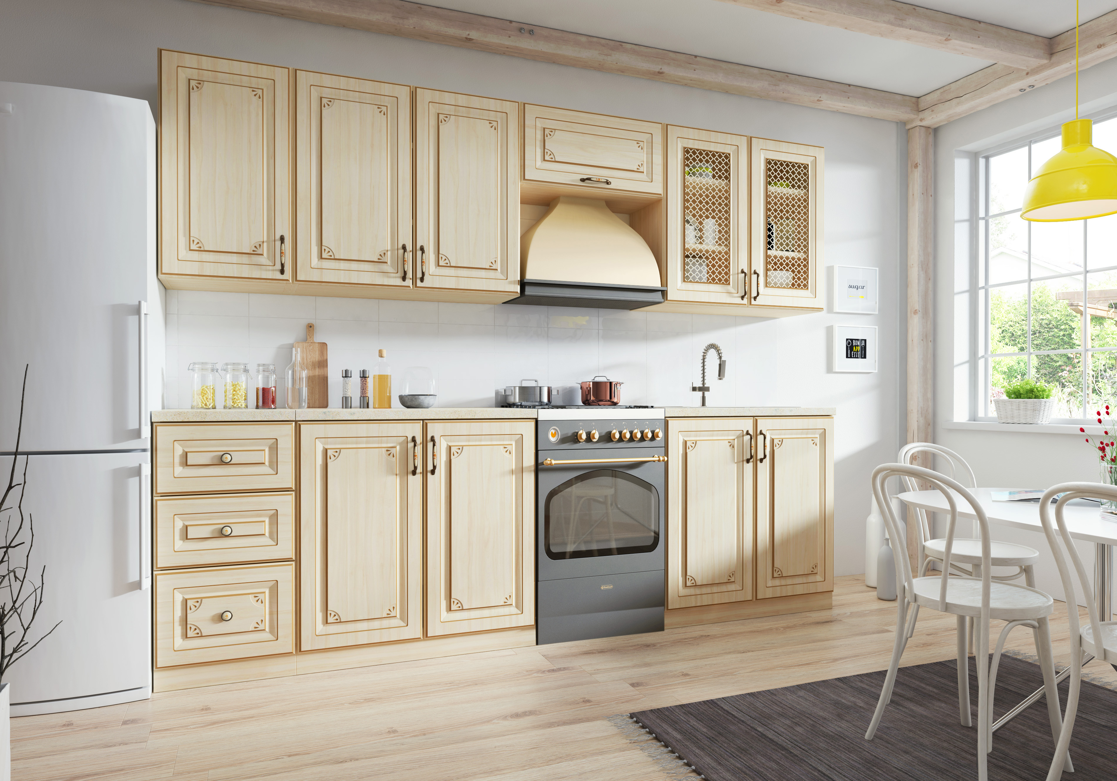 Uredite svoju kuhinju prema svojim željama u rustikalnom stilu. U ponudi su gornji i donji ormarići, ali i ormarići pogodni za ugradbene aparate. Također se može kupiti i visoki ormar za namirnice. Svaki ormarić izrađen je od visokokvalitetnog medijapana i ima zanimljive ručke.